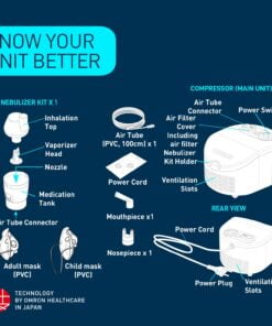 - User-friendly – for a fuss-free application, the nebulizer administers medication at the touch of a button and complete set of attachments available