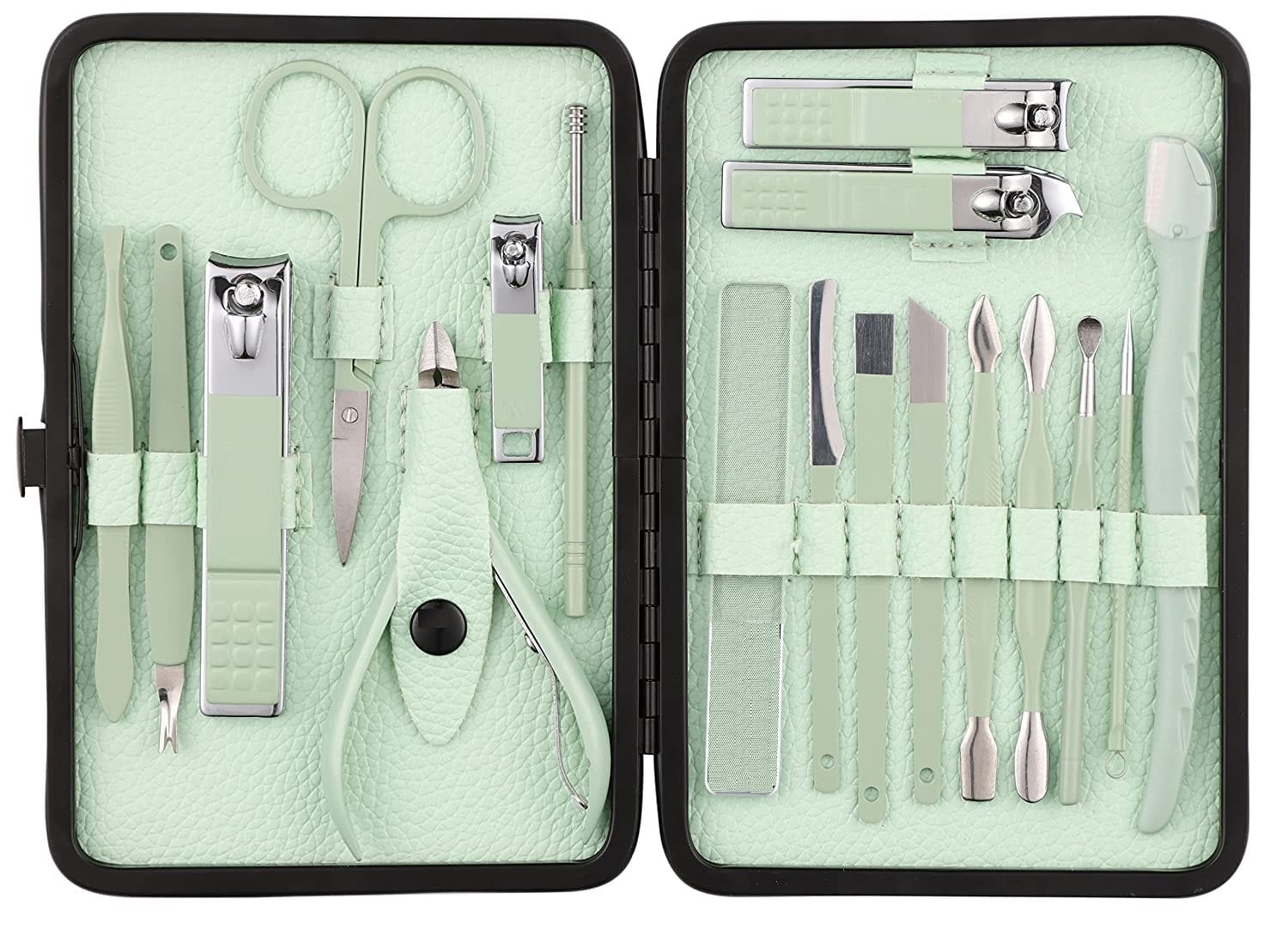 “Nail Cutter Set, 18 Pieces Grooming Kit (Eyebrow Razor, Tweezer, Hair Plucker, Baby Nail Cutter, Ear Cleaner,Nail Cleaner,) Pedicure Gift for Men and Women, Green”