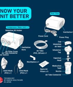 - Contains: Compressor, nebulizer kit, air tubes, 5 pieces replacement filters, mouth piece, adult mask, child mask, instruction manual and carrying bag