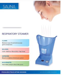 BENEFITS: [Relieves cold]- Nose steamer is provided to promote relief from cold, throat infection and congestion problems. You can add inhalants to the vaporizers like Vicks and other medicines [Enhances beauty]- Facial Steamer can be used for beauty purpose. You can use the sauna during facial, massaging and at the time of clean up. The vaporizer helps to clear the clogs and open the facial pores present deeply
