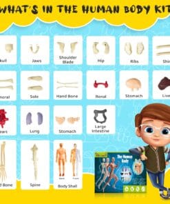 - Everything you need, to learn about the human body is included – The Human Body Kit consists of Skull, Jaws, Shoulder Blade, Hip, Ribs, Shin, Femoral, Sole, Hand Bone, Renal, Stomach, Liver, Heart, Lung, Small Intestine, Large Intestine And Many More And A Guide