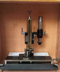 - Traveling Microscope with brass metal horizontal scale 16.5 cm and vertical scale 14 cm. Complete with nicely polished wooden box.